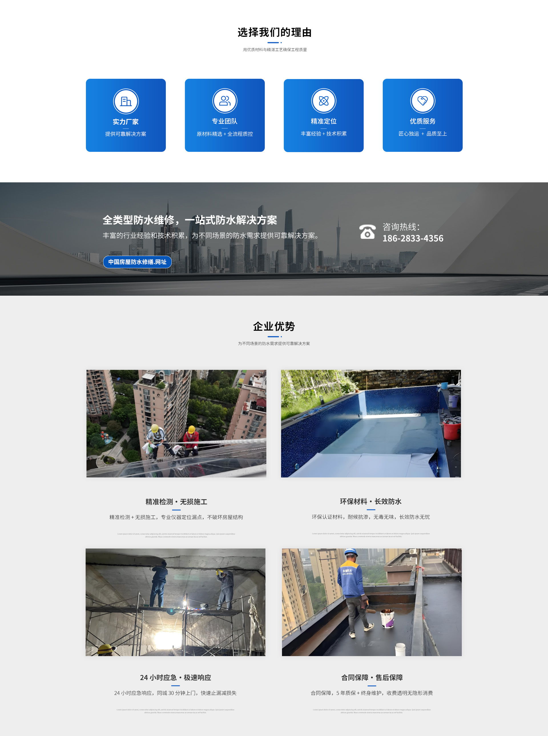 业务范围涵盖屋面、外墙、窗户、阳台、厨房、卫生间等民用建筑漏水维修,同时涉及地下室、电梯井、管廊、隧道、玻璃幕墙、阳光房、游泳池、厂房、水电站等特殊场景的防水处理,另提供地空鼓治理与管道漏水检测服务。